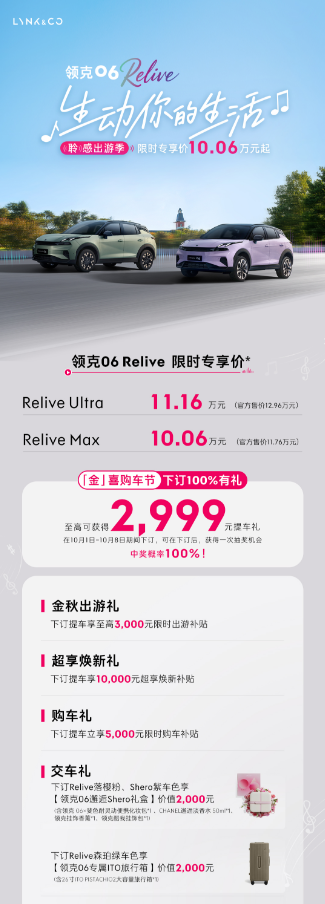当下,领克推出的金秋限时购车福利,进一步降低了年轻人的购车门槛。目前入手领克06Relive,可享受至高3000元的限时出游补贴、10000元的超享焕新补贴以及5000 元的限时购车补贴,叠加各种补贴后限时专享价10.06万元起;有意向的消费者可前往线下门店咨询。值得一提的是,在10月1日-10月8日期间下订领克06 Relive,可在下订后获得一次抽奖机会,至高可获得2999元提车礼,中奖概率100%。