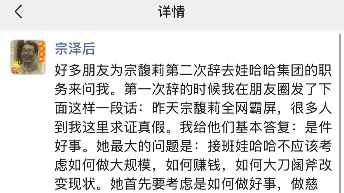 叔叔宗泽后发声:水军害了宗馥莉,使她越走越远、无法回头宗馥莉已于9月12日向娃哈哈集团有限公司辞去董事长等相关职务并已通过集团股东会和董事会的相关程序。